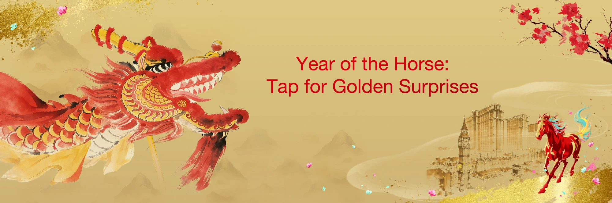Celebrate the Year of the Horse at The Londoner Macao, where every tap unlocks golden surprises and festive delights. Immerse yourself in the vibrant spirit of the Spring Festival, adorned with auspicious decorations. Savour culinary delights by our talented chefs, blending tradition with innovation, and explore exclusive Chinese New Year shopping offers from top international brands. Join us for a joyful festive season filled with delicious flavours, shopping privileges, setting the stage for a prosperous and lucky new year ahead!